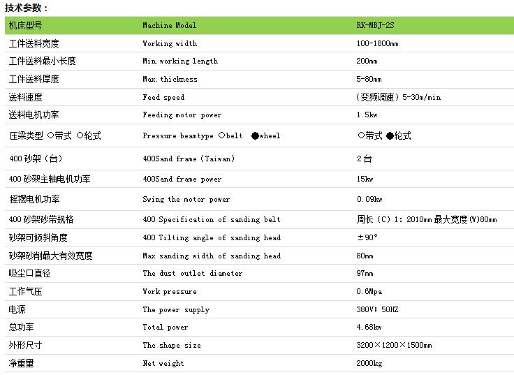2.本机种砂带速度及送料速度均采用无段变速度,适合各种木材白身或在漆砂光。
