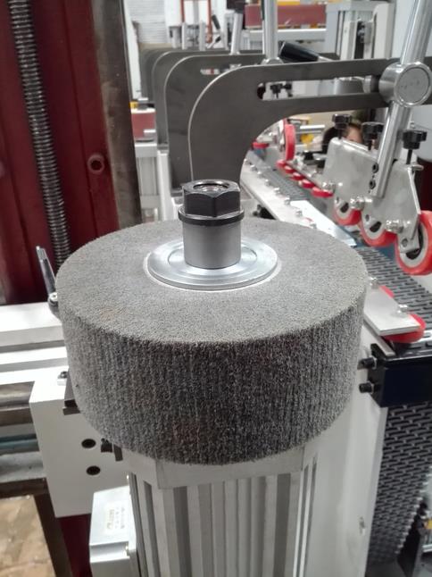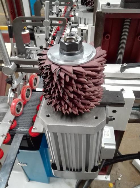 使用TBM材料(氧化铝、碳化硅酮树脂)、聚亚胺脂研磨轮、无纺布轮、砂轮、尼龙轮、纱布条轮等研磨材料修成适合于工件表面的形状,在砂头电机的带动下对工件进行分段式仿形研磨。