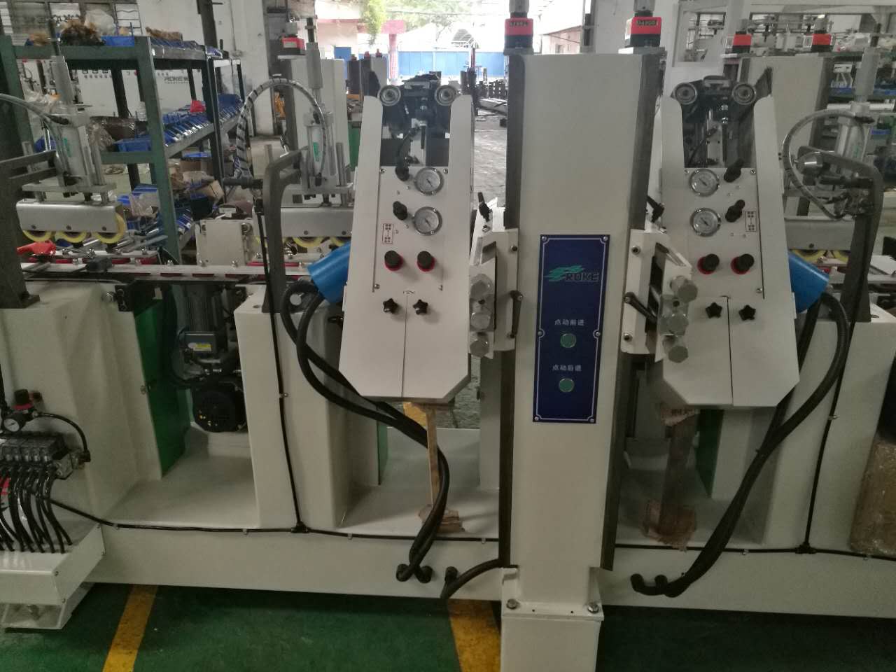 5.采用多点分段多角度压料方式,在顺利输送各种表面异形工件同时,防止工件左右摆动,并纠正工件左右弯曲,由于所有压料位均为橡胶材质,因此,能有效的避免对工件表面的摩擦损伤。